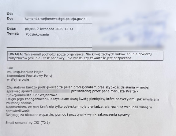 Do Komendy Powiatowej Policji w Wejherowie dotarły serdeczne podziękowania od mieszkanki powiatu, która dzięki zaangażowaniu asp. Mariusza Krefta odzyskała 10 tysięcy złotych, które straciła pożyczając je nieuczciwej osobie. Mieszkanka wyraziła wdzięczność policjantowi za jego profesjonalizm i skuteczność w odzyskaniu tej znacznej sumy.