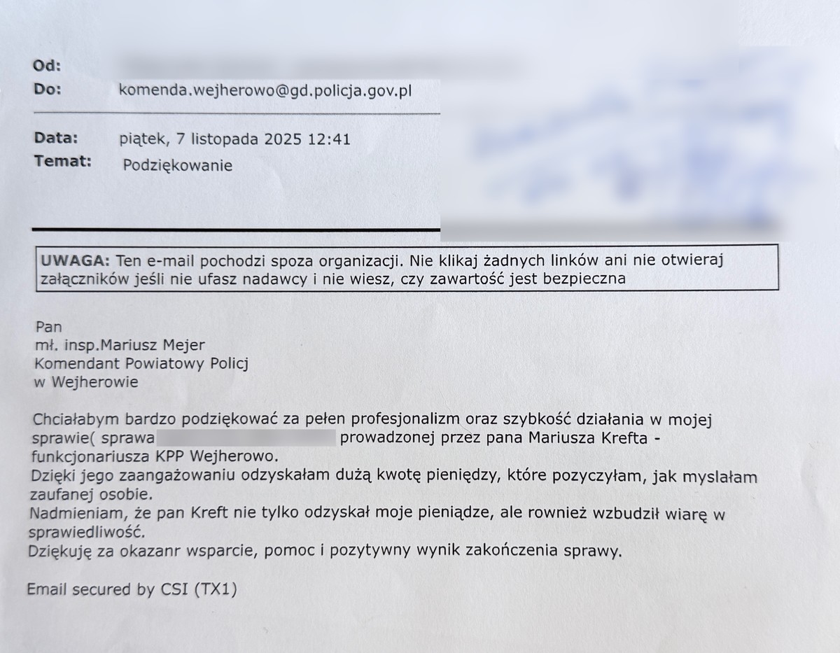 W Komendzie Powiatowej Policji w Wejherowie otrzymano e-mail z podziękowaniami dla asp. Mariusza Krefta, funkcjonariusza z wydziału dochodzeniowo-śledczego. Mieszkanka naszego powiatu doceniła jego pełen profesjonalizm, skuteczność i szybkie działania, które pozwoliły jej odzyskać dużą kwotę pieniędzy.